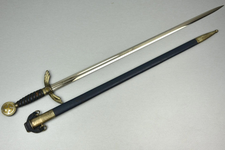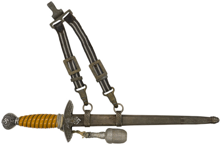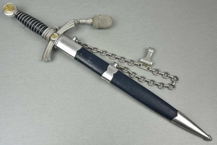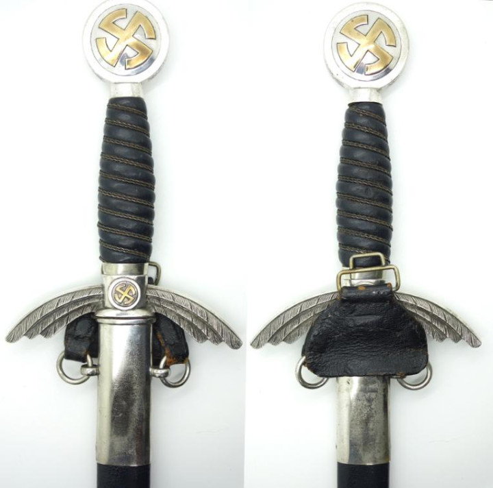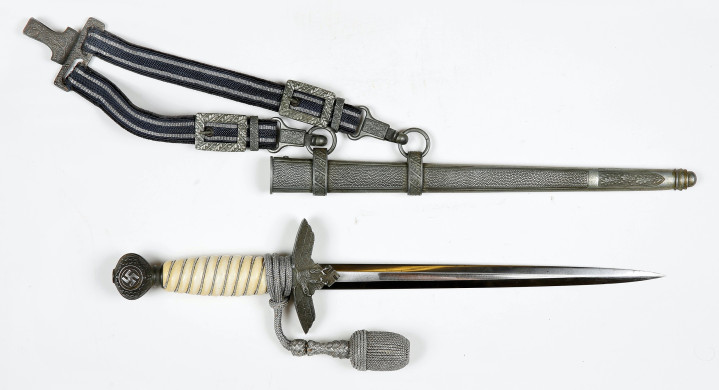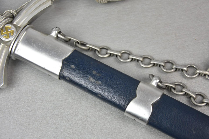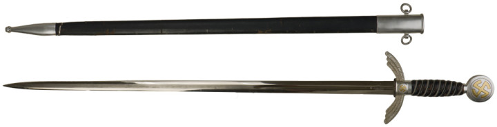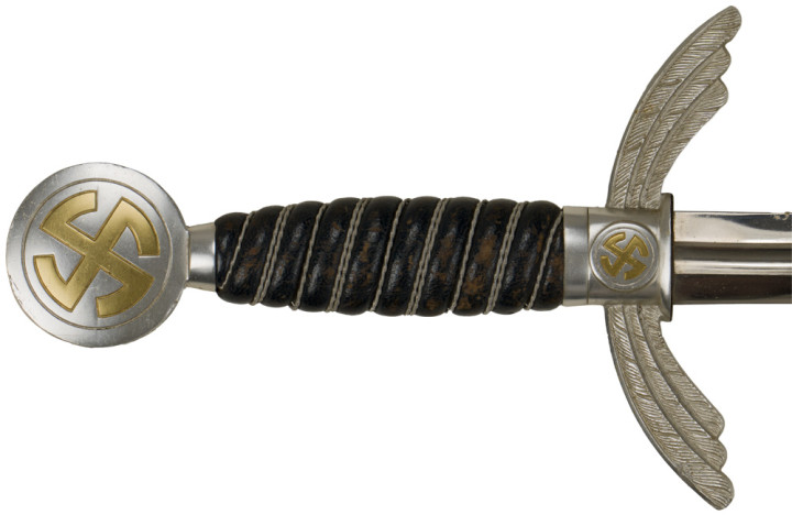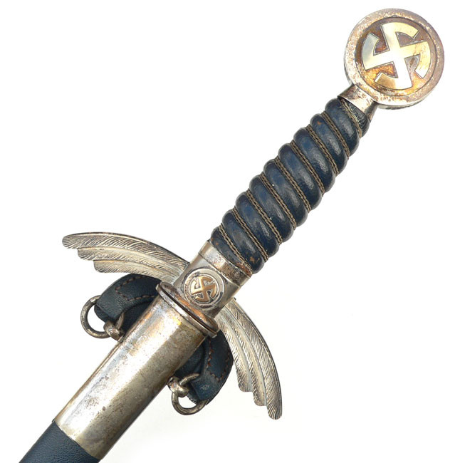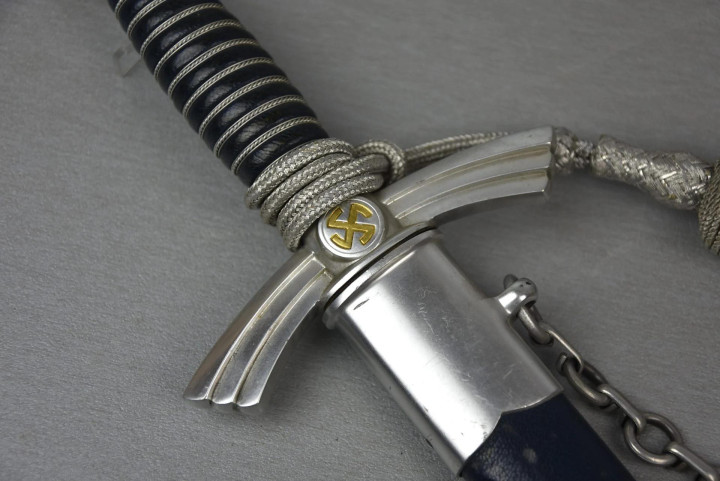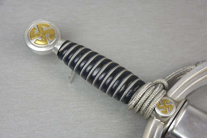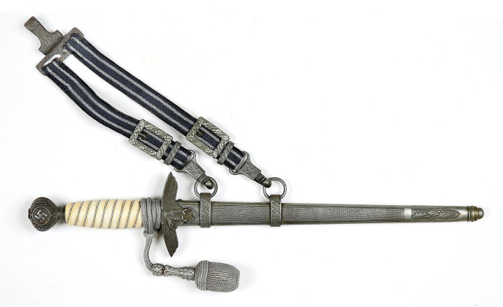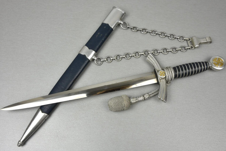 佩剑和短剑 佩戴装饰性武器的传统起源于19世纪初普鲁士军队,并一直延续到纳粹德国时代。1934年帝国航空部长戈林下令引入军官佩剑,而军士和士兵获准佩戴短剑。1937年7月德国空军推出第二版短剑,供军官和军官级文职人员佩戴,该规定在1940年拓展到高级军士,之后第一版短剑随之停产。 1944年随着战局恶化以及盟军即将进入德国本土,德国空军颁布限制佩戴佩剑和短剑的命令。此时佩戴手枪作为副武器比佩剑和短剑更为实用。这项规定最初在被占领国内实施,最终在1944年12月23日规定中全面禁止空军人员佩戴佩剑和短剑。军官和军官级文职人员须自行购买佩剑和短剑。军官通常在特供商店选购,这些商店采用象牙等奢华材料装饰佩剑和短剑,并在金属部件上雕刻装饰纹样。此类装备通常由专业分包商生产,而非大型兵工厂制造。 军官佩剑 1933年3月,纳粹德国成立德国航空运动协会(Deutscher Luftsport Verband),将所有民间航空俱乐部整合成统一全国性组织。该协会以民间组织为掩护,用于规避《凡尔赛条约》禁令,暗地里为未来德国空军培养人才。1934年2月和4月,德国航空运动协会分别推出佩剑和短剑。同年晚些时候,德国航空运动协会的秘密军事分支-飞行员组(Fliegerschaft)成员开始佩戴佩剑和短剑。飞行员组人员来源于魏玛防卫军军人,他们退役然后加入,保留原军衔,作为未来空军飞行员培养。1934年末赫尔曼·戈林推出荣誉佩剑(Ehrenschwert),专门授予飞行员组中特别遴选的人员。 1935年3月德国空军正式成立后,沿用了荣誉佩剑,其官方名称更改为军官佩剑(Offizierschwert),授予所有表现优异的空军军官,其还有个名字被称为飞行员佩剑(Fliegerschwert)。1936年条例规定所有空军军官和上士级候补军官须在身穿值勤套装,报告套装,外出套装和阅兵套装佩戴军官佩剑,后拓展到高级军士。早期军官佩剑的金属配件为采用镍银制(铜镍锌合金仿银材料),从1940年开始采用铝制。根据1944年12月23日颁布命令,从即日起废除军官佩剑。