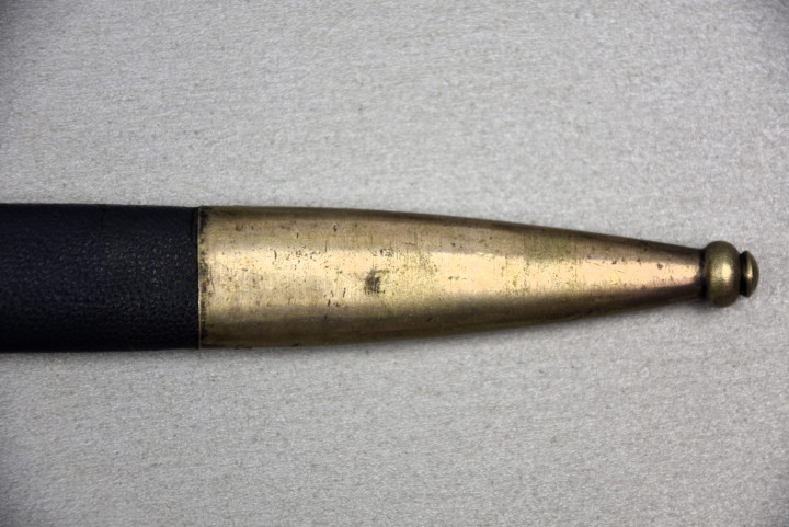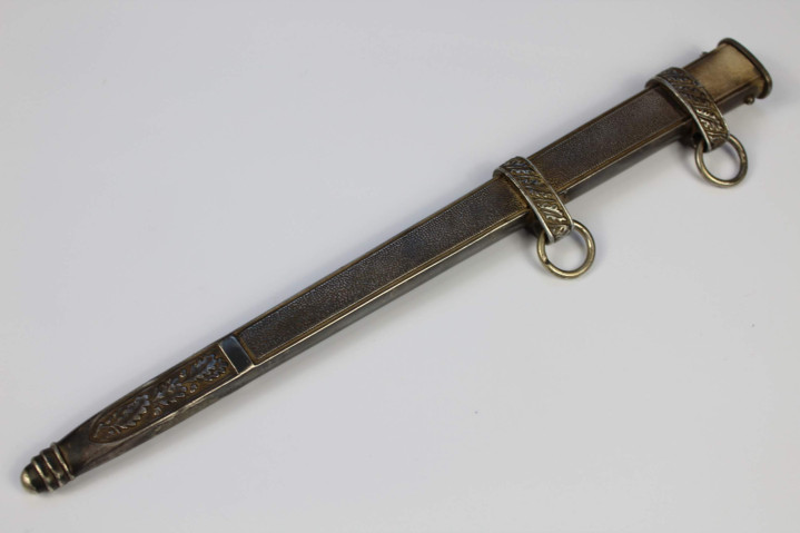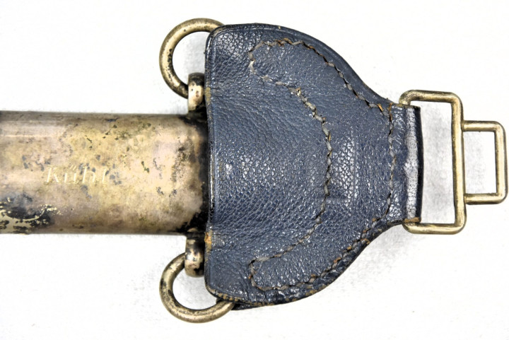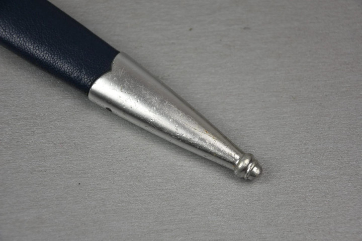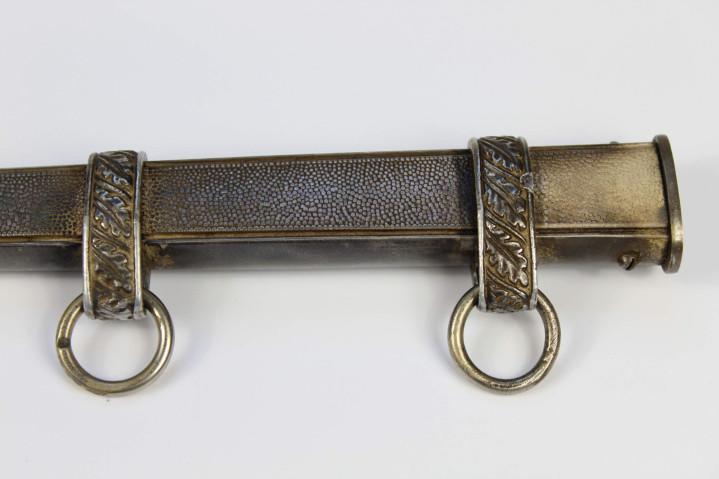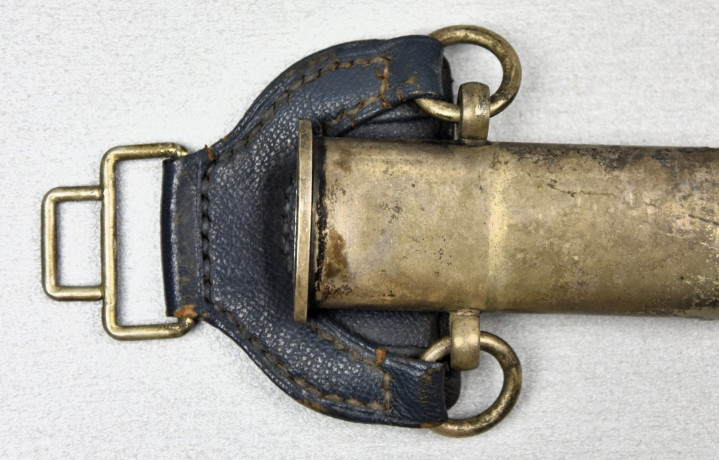 剑鞘由金属制成,表面覆盖深蓝色摩洛哥皮革。剑鞘的鞘口和鞘尖金属配件采用镍银配件。鞘口金属配件两侧各焊接一个小金属圆环和深蓝色皮革护套(防止金属配件磨损军服)大圆环连接,护套顶部的矩形环扣系在军服内置腰带上。