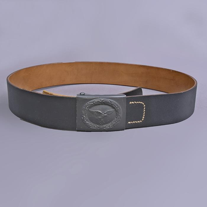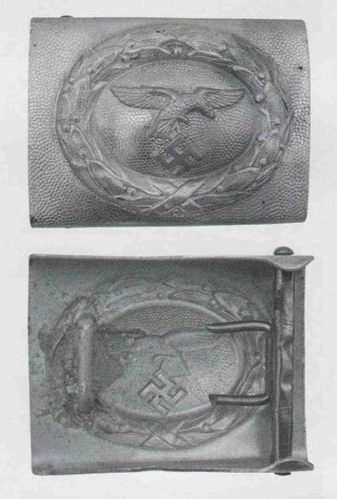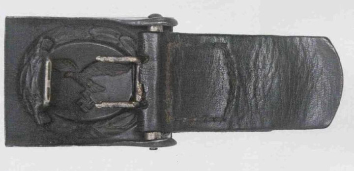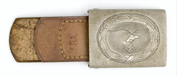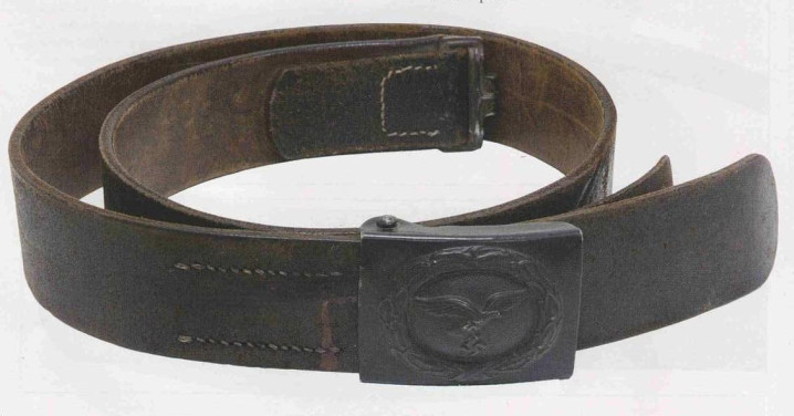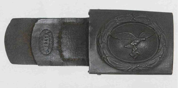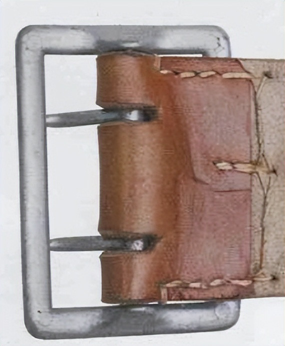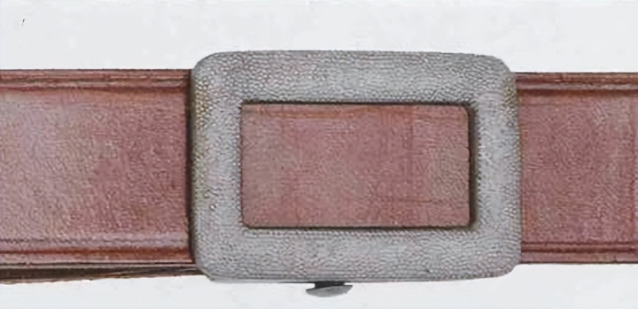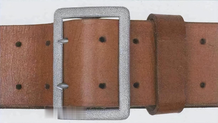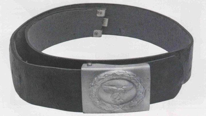 接上文: 腰带 军用腰带和腰带扣使用可以追溯到几个世纪之前。历史上各国士兵经常佩戴腰带(通常由皮革制成)来携带武器并固定军服。短剑会插在腰带内,佩剑则悬挂在腰带一侧。1847年,一位普鲁士军人发明了快速解开的新型盒式腰带扣及其相应腰带,其中还包括斜挎肩带,可以将腰带悬挂装备的重量分散到肩部负担。 纳粹德国时期对军用腰带和腰带扣的佩戴方式有严格规定:腰带扣应位于右侧,对应扣环则位于左侧。空军军士和士兵腰带扣最初在1935年5月启用,1937年末或1938年初曾进行微调,更换了新空军鹰徽图案,1940年又进行结构改良,细节略有差异。 德国空军人员最初使用棕色皮革装备,但在二战期间,皮革装备普遍涂黑。最初根据政府合同生产的腰带扣增加了皮革衬片,作用是帮助支撑弹药袋并防止滑动,但在1942年规定中取消了衬片以节约皮革,不过该规定没有得到完全遵守。 军官腰带 军官腰带采用棕色皮革制成,厚3.5毫米,宽6厘米,二战期间为节约皮革原材料而缩减了尺寸。二战前腰带两侧边缘压印宽1毫米的凹槽,此设计在多数战时生产腰带中取消。军官腰带的腰带扣样式为矩形双针扣,采用磨砂白色金属制成,表面为颗粒纹路。系扣方向为由右至左,腰带扣位置覆盖军服前襟最后一枚纽扣。