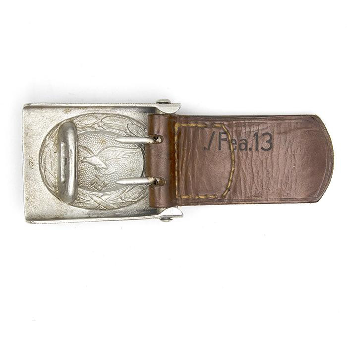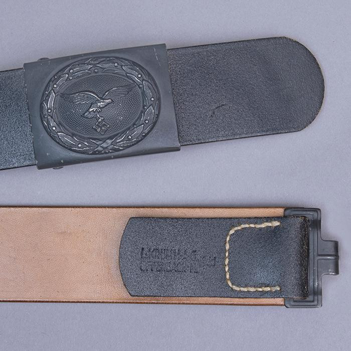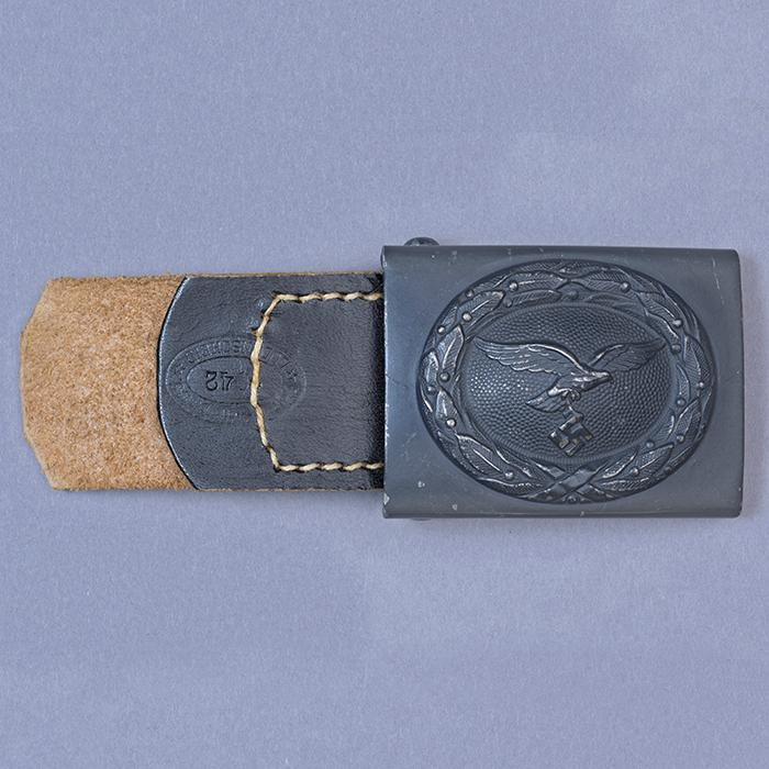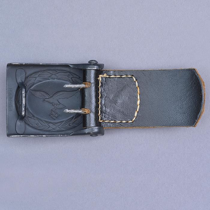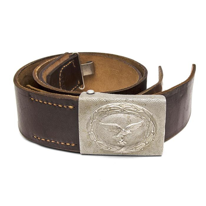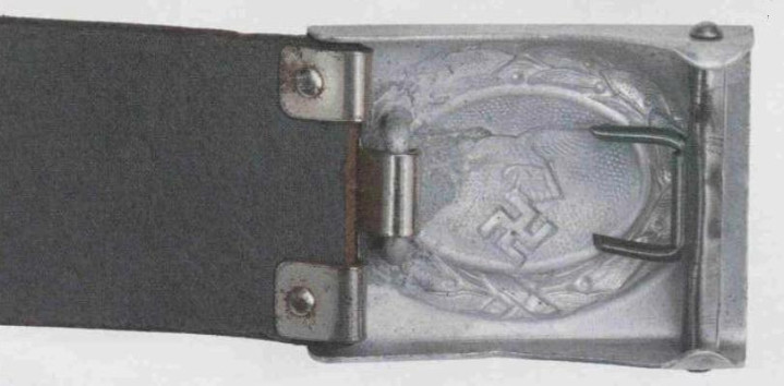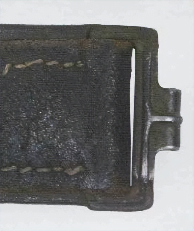 接上文: 腰带 军用腰带和腰带扣使用可以追溯到几个世纪之前。历史上各国士兵经常佩戴腰带(通常由皮革制成)来携带武器并固定军服。短剑会插在腰带内,佩剑则悬挂在腰带一侧。1847年,一位普鲁士军人发明了快速解开的新型盒式腰带扣及其相应腰带,其中还包括斜挎肩带,可以将腰带悬挂装备的重量分散到肩部负担。 纳粹德国时期对军用腰带和腰带扣的佩戴方式有严格规定:腰带扣应位于右侧,对应扣环则位于左侧。空军军士和士兵腰带扣最初在1935年5月启用,1937年末或1938年初曾进行微调,更换了新空军鹰徽图案,1940年又进行结构改良,细节略有差异。 德国空军人员最初使用棕色皮革装备,但在二战期间,皮革装备普遍涂黑。最初根据政府合同生产的腰带扣增加了皮革衬片,作用是帮助支撑弹药袋并防止滑动,但在1942年规定中取消了衬片以节约皮革,不过该规定没有得到完全遵守。 军官腰带 军官腰带采用棕色皮革制成,厚3.5毫米,宽6厘米,二战期间为节约皮革原材料而缩减了尺寸。二战前腰带两侧边缘压印宽1毫米的凹槽,此设计在多数战时生产腰带中取消。军官腰带的腰带扣样式为矩形双针扣,采用磨砂白色金属制成,表面为颗粒纹路。系扣方向为由右至左,腰带扣位置覆盖军服前襟最后一枚纽扣。