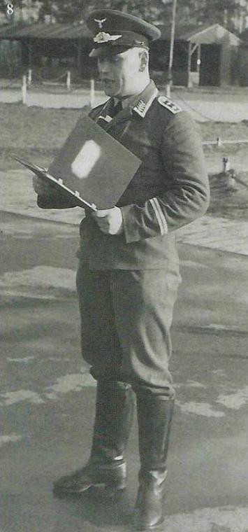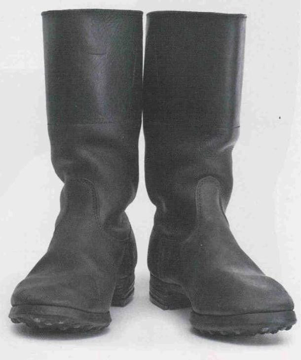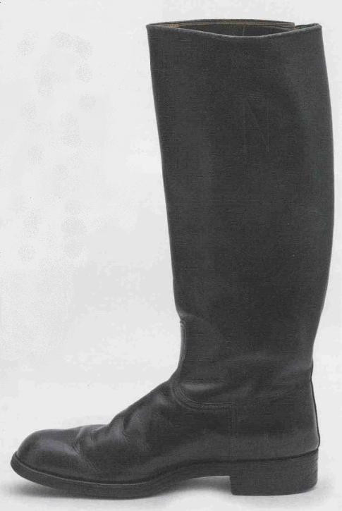 军靴 高筒皮靴是德国军队最具辨识度的装备之一,其历史最早可以可追溯到17世纪末,当时欧洲贵族在骑马狩猎时将高筒皮靴套在礼服鞋外穿着。进入20世纪后,大多数欧洲国家都将高筒皮靴作为军队制式装备之一。 德国空军军士和士兵身穿的高筒皮鞋和其他兵种相同。空军高筒皮鞋配发时为天然棕色,但士兵必须使用鞋油保持其黑色光泽。为了增加耐用性,皮革鞋底会钉入鞋钉加固。为了节约皮革原材料,1939年开始高筒皮鞋的高度缩短,并最终在1941年全军配发系带的低筒靴。军士和士兵可以自行购买质量更好的高筒皮靴。军官和高级军士在身穿马裤或骑马时通常身穿马靴。二战期间,许多战斗机飞行员在执行任务时倾向于身穿马靴或高筒皮靴,但因多次受伤后不方便脱下导致伤势加剧,最终空军强制要求飞行员只能身穿飞行靴。 军官马靴 二战初期,军官身穿马裤时允许身穿马靴。部分战斗机飞行员在执行作战任务时也更倾向于身穿马靴而非飞行靴。军官马靴大多是委托私人制鞋匠定制,所以这些马靴通常采用更高品质的皮革,并以精湛工艺制作而成。多数马靴基于民用款式设计,存在违背军服条例的特征。但鉴于战斗机飞行员在德国空军中享有特权地位,所以上级往往对这些违规睁一只眼闭一只眼。 军官马靴高度通常高于行军靴,但不同制造商生产的高度仍存在差异。