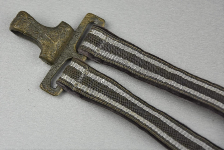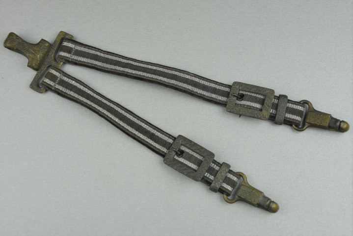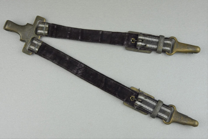剑挂由两条蓝色编织带组成,编织带两侧是银色铝线条纹。每条编织带配一个带橡叶纹饰的金属矩形调节扣,用于调节长度。蓝色编织带背面为天鹅绒或毛毡材质。两条蓝色编织带顶部固定在金属钩上,底部各配一个弹簧扣。