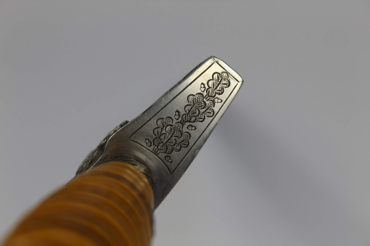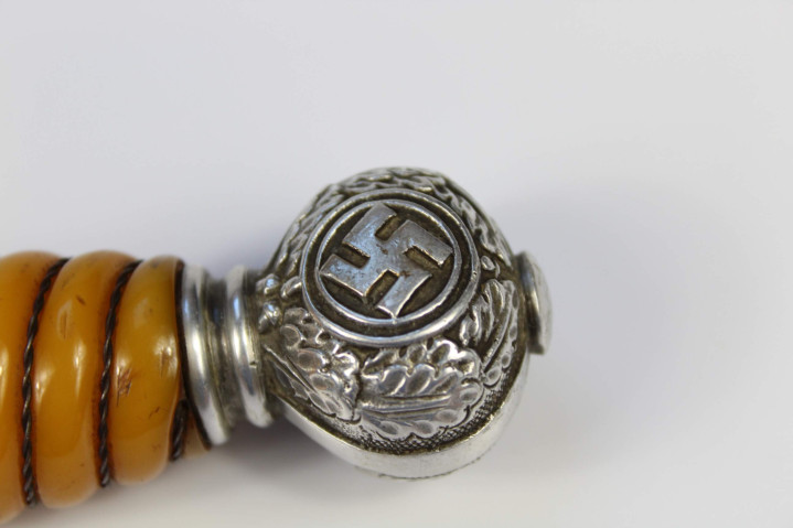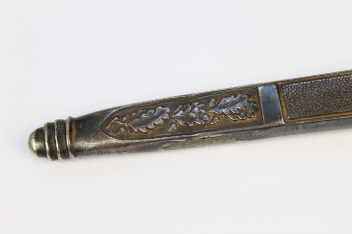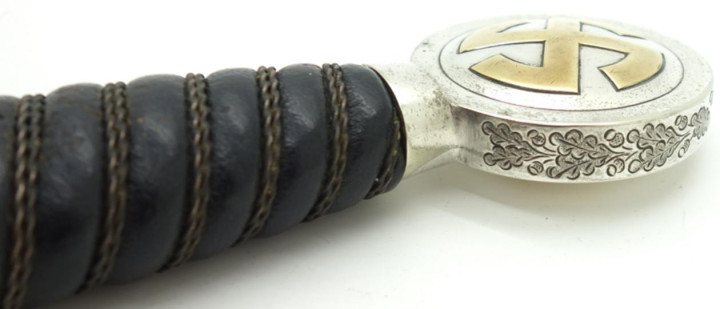 剑柄为木制包裹深蓝色摩洛哥皮革,表面带有纵向凹槽,内嵌双股银色铝线扭绳盘旋缠绕。剑首为银色圆形,中间是镀金的万字太阳轮图案。剑首侧面雕刻橡叶纹饰。