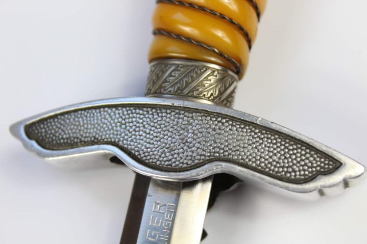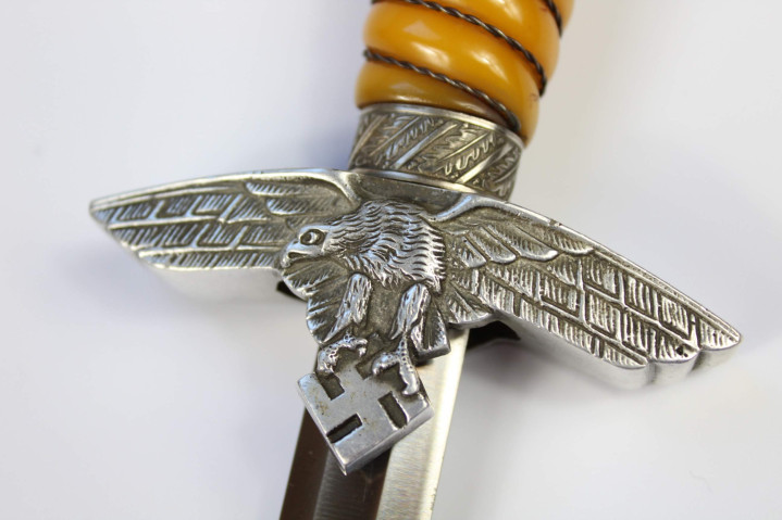 第二版匕首 1937年7月15日德国空军推出第二版短剑,仅供军官,上士级候补军官和高级军士使用。第二版短剑制造商成本更低而且工艺简单,在多个方面和第一版短剑存在差异。短剑的剑柄采用实心塑料或木制表面覆盖塑料材质,颜色从橙色到白色不等。护手样式为空军鹰徽,鹰头向右,鹰爪抓着倾斜45度万字,双翼向下倾斜。推出第二版短剑后,第一版短剑随即停产,根据1944年12月23日颁布命令,从改日起废除所有类型短剑。