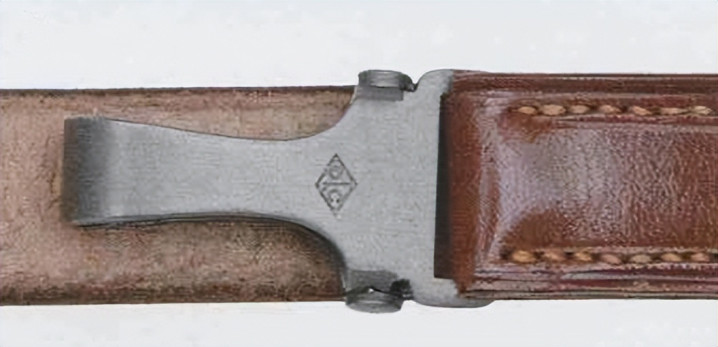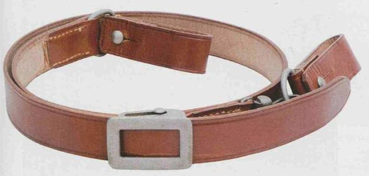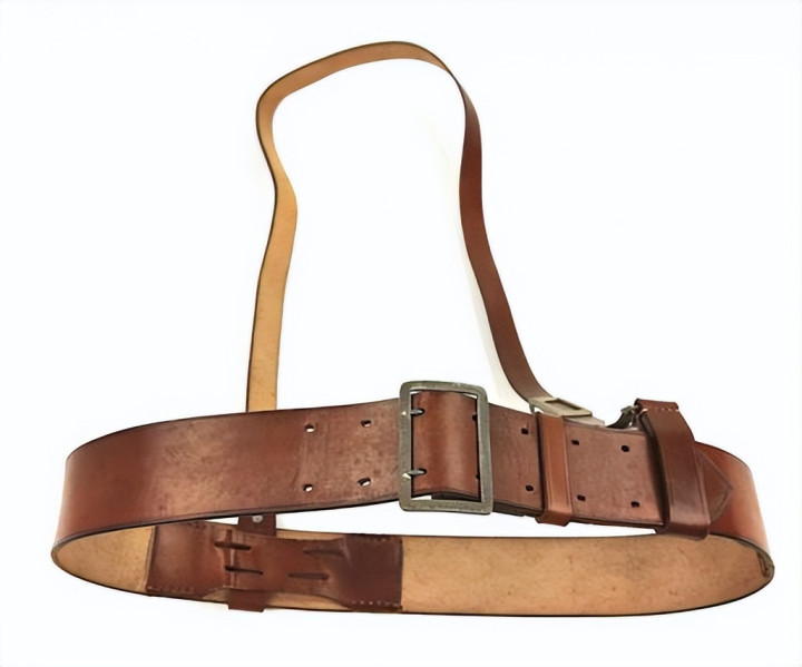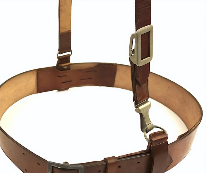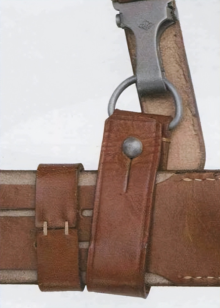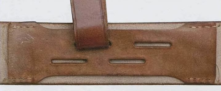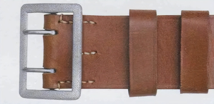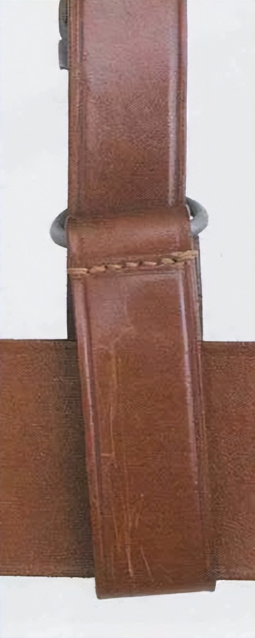 皮革环由棕色皮革制成,两端折叠,用金属铆钉固定。皮革环一端配金属D环,然后向内折叠缝线固定。军官腰带内侧缝有两条皮革带,上面配多条水平孔眼,皮革环插入水平孔眼后,可以防止前后移动。