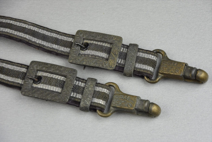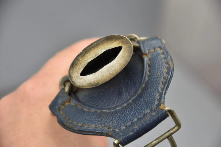 斜挎肩带宽2.4厘米,配一根金属矩形调节扣来调整长度。前端内侧缝有弹簧扣,弹簧扣固定在一个带金属D环的皮革环上,皮革环再套在军官腰带上即可。
