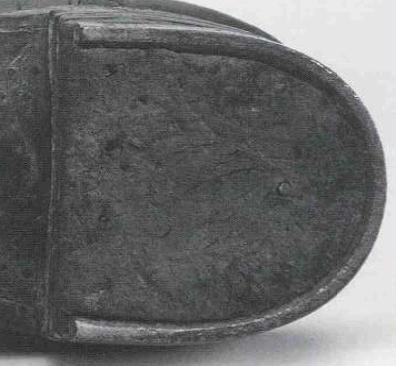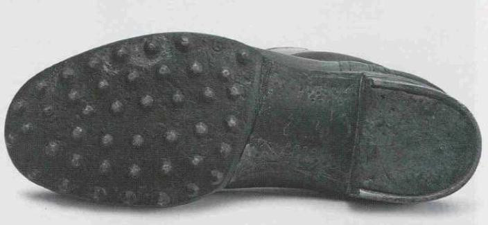 鞋底通常为一整块厚实皮革制成,额外增加一块皮革或橡胶材质作为鞋跟。图中前掌位置的圆点是固定钉子。