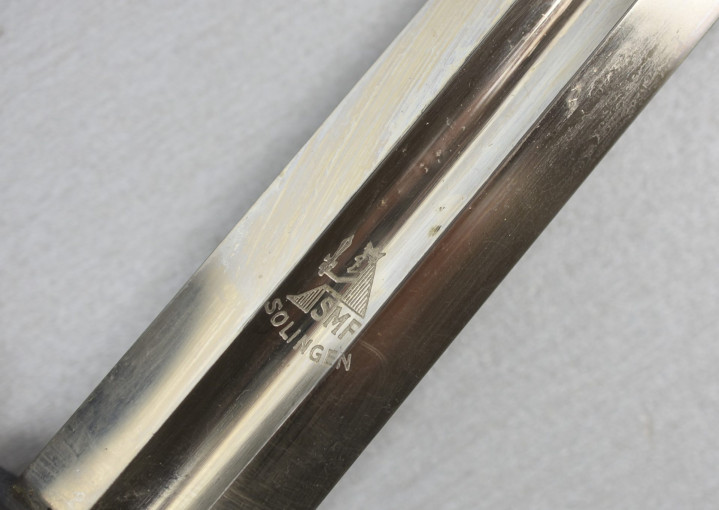 剑身由镀镍钢材制成,上面印有制造商SMF商标,样式是一位国王手持宝剑并剑指天际,下面是"SMF"和“Solingen(索林根)”字样,代表索林根的施托克公司(SMF-Solinger Metallwaffenfabrik,索林根金属武器工厂)制造。该公司公司最初生产钢铁制品,在纳粹时期业务拓展至金属武器,以生产冲锋队短剑著称。
