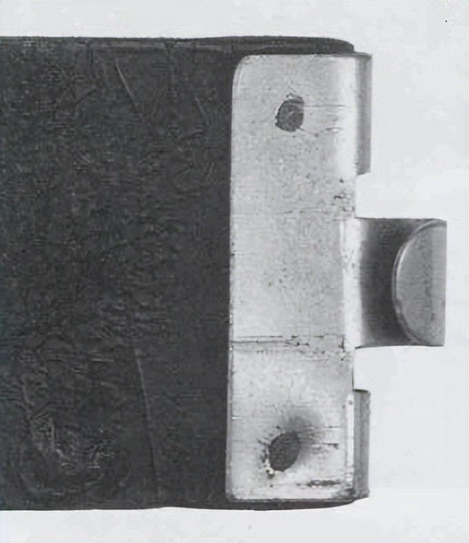 图中是一款空军士兵棕色腰带,盒式腰带扣上配皮革衬片。皮革衬片的作用是帮助支撑弹药袋并防止其滑动,还有个作用是当双叉插入腰带背面孔眼后,向外拉皮革衬片可以将腰带扣扣得更紧。