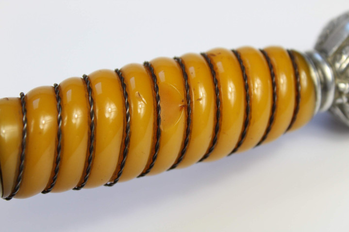 剑柄为橙黄色胶木材质,剑柄凹槽内嵌有银色铝线扭绳。