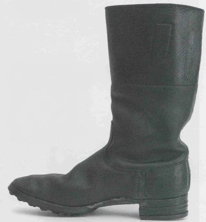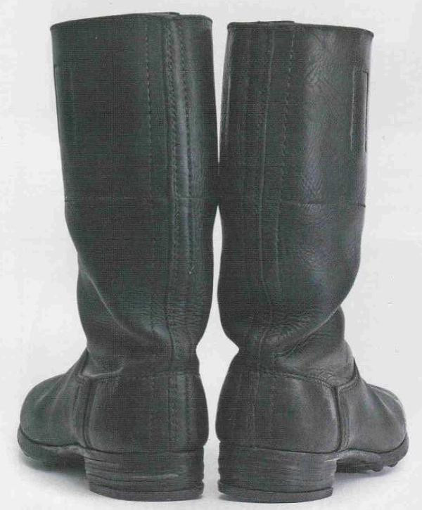 军士和士兵行军靴 行军靴(Marschstiefel)就是配发给军士和士兵的高筒皮靴,采用黑色皮革制成。由于皮革原材料短缺问题日益严峻,1939年9月规定行军靴仅限于野战部队使用。1939年11月另一项规定缩短了行军靴高度以节约皮革。随着战争进行,1943年颁布命令彻底停产高筒行军靴。 行军靴的鞋面由两块皮革构成。较大的前皮革呈舌状,延伸至脚背处。前皮革通过侧面双重缝线和覆盖脚跟处的后皮革连接。鞋身通常采用皮革绒面朝外,作用是防水。