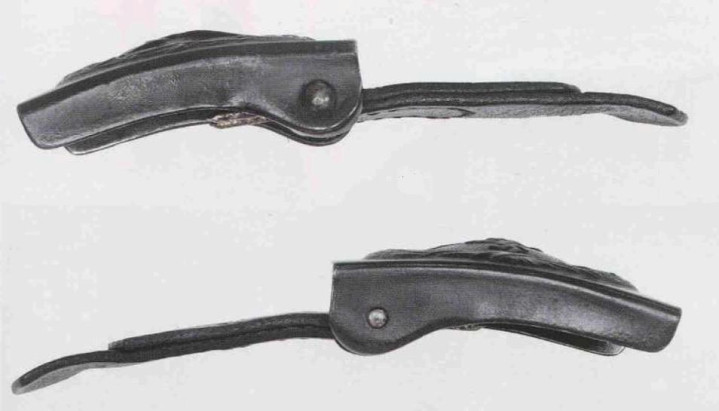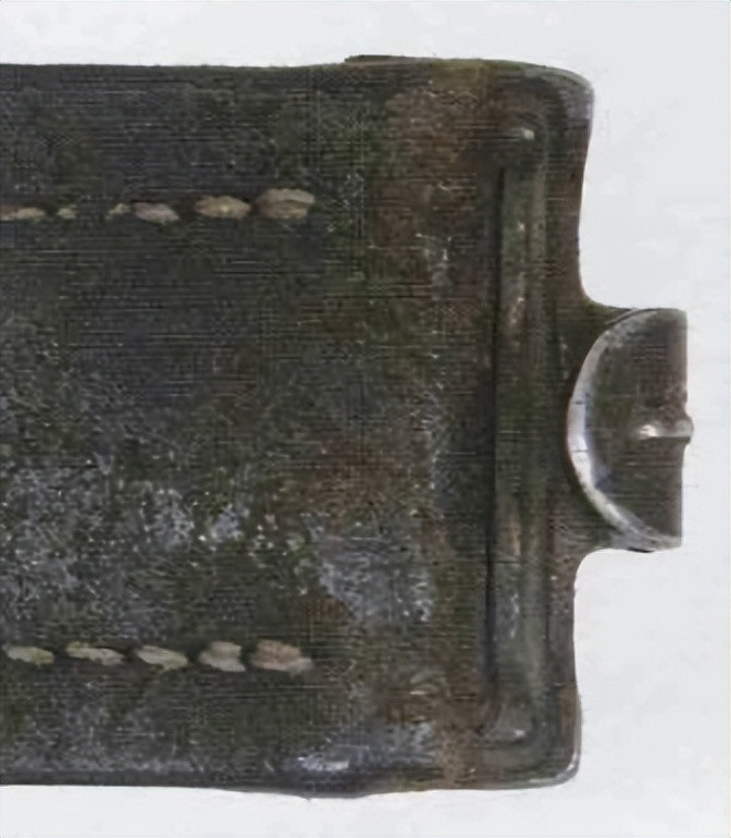 盒式腰带扣的图案由冲压制成。图中盒式腰带扣左侧(佩戴者视野右侧)背面上下内壁之间固定一根可动圆柱,圆柱焊接了金属双叉,右侧(佩戴者视野左侧)内壁焊接一根矩形固定支架。
